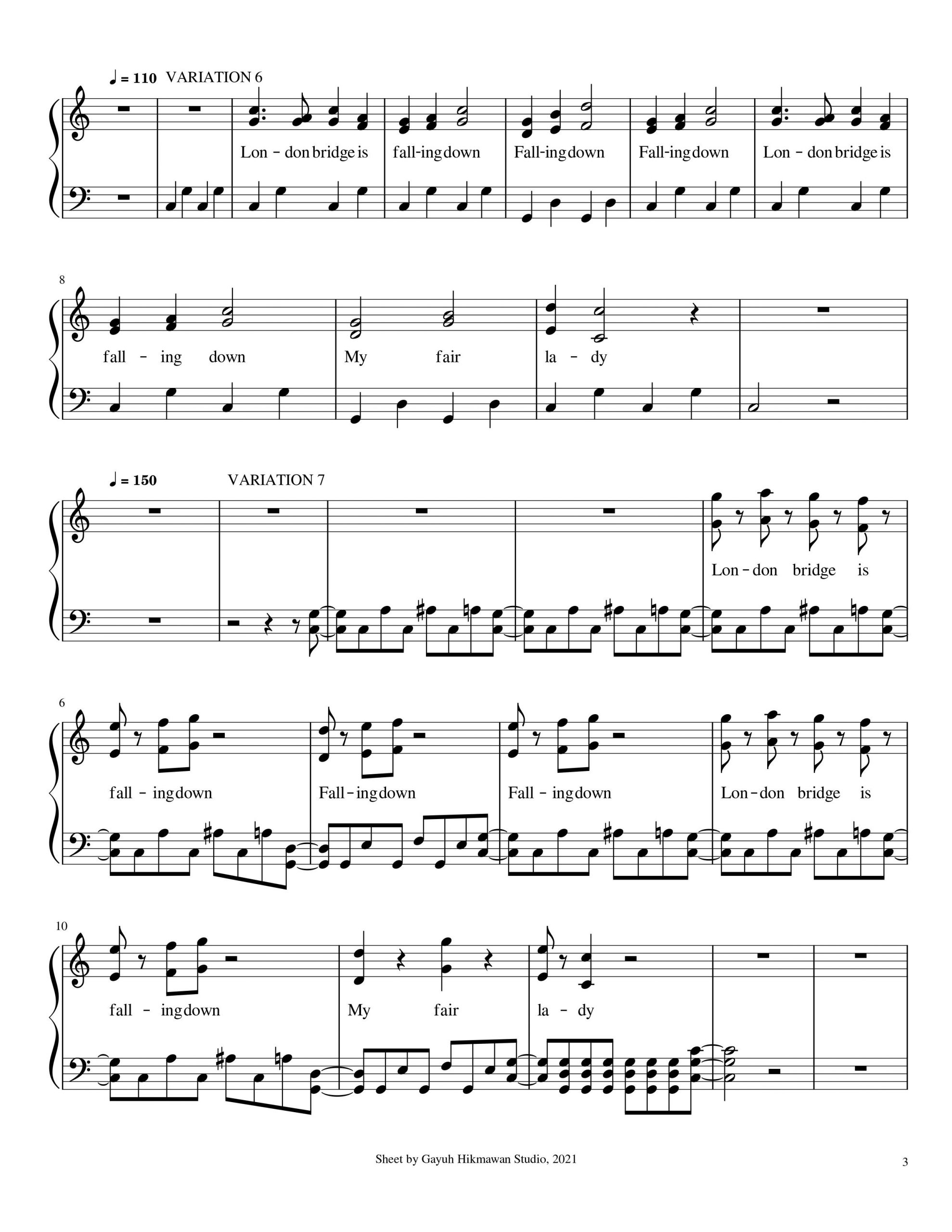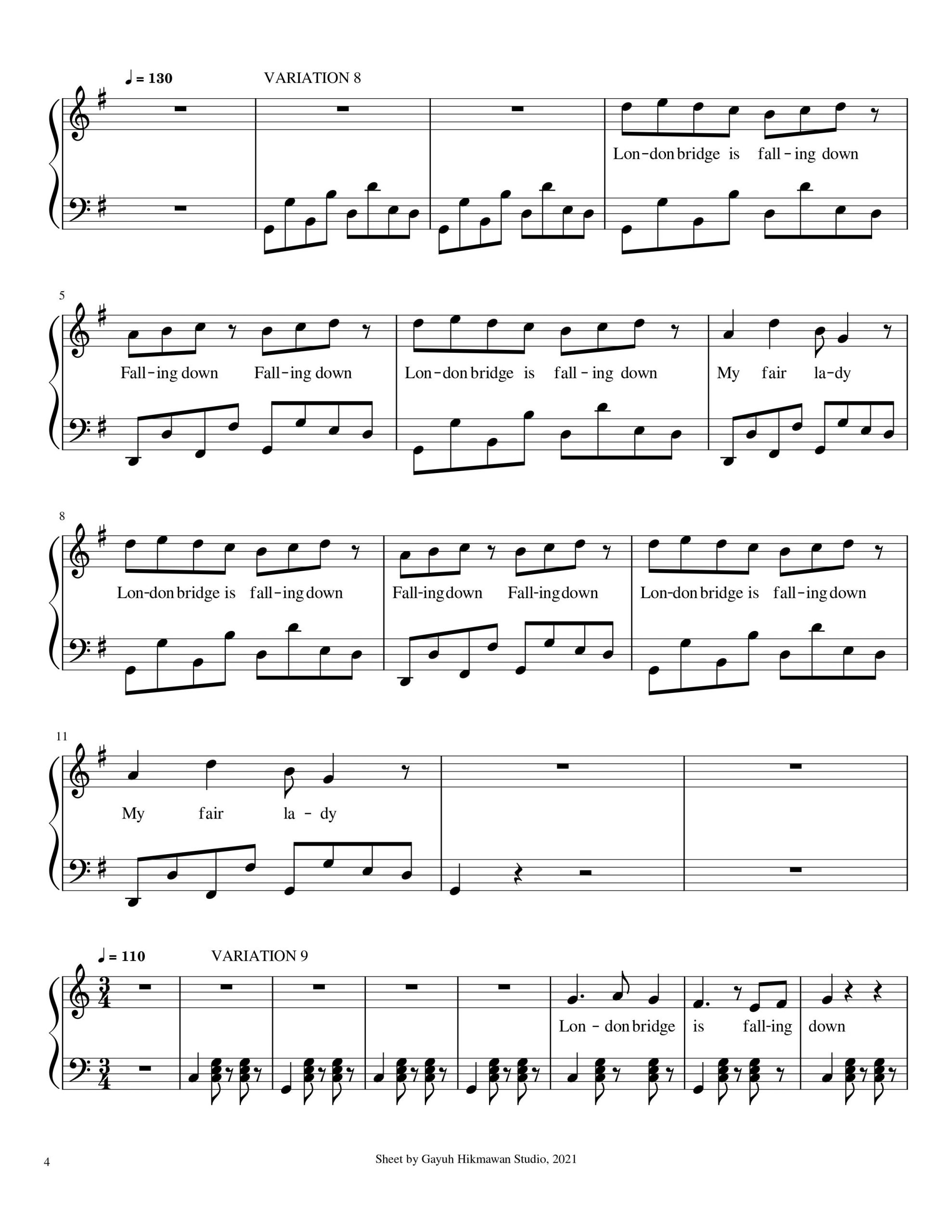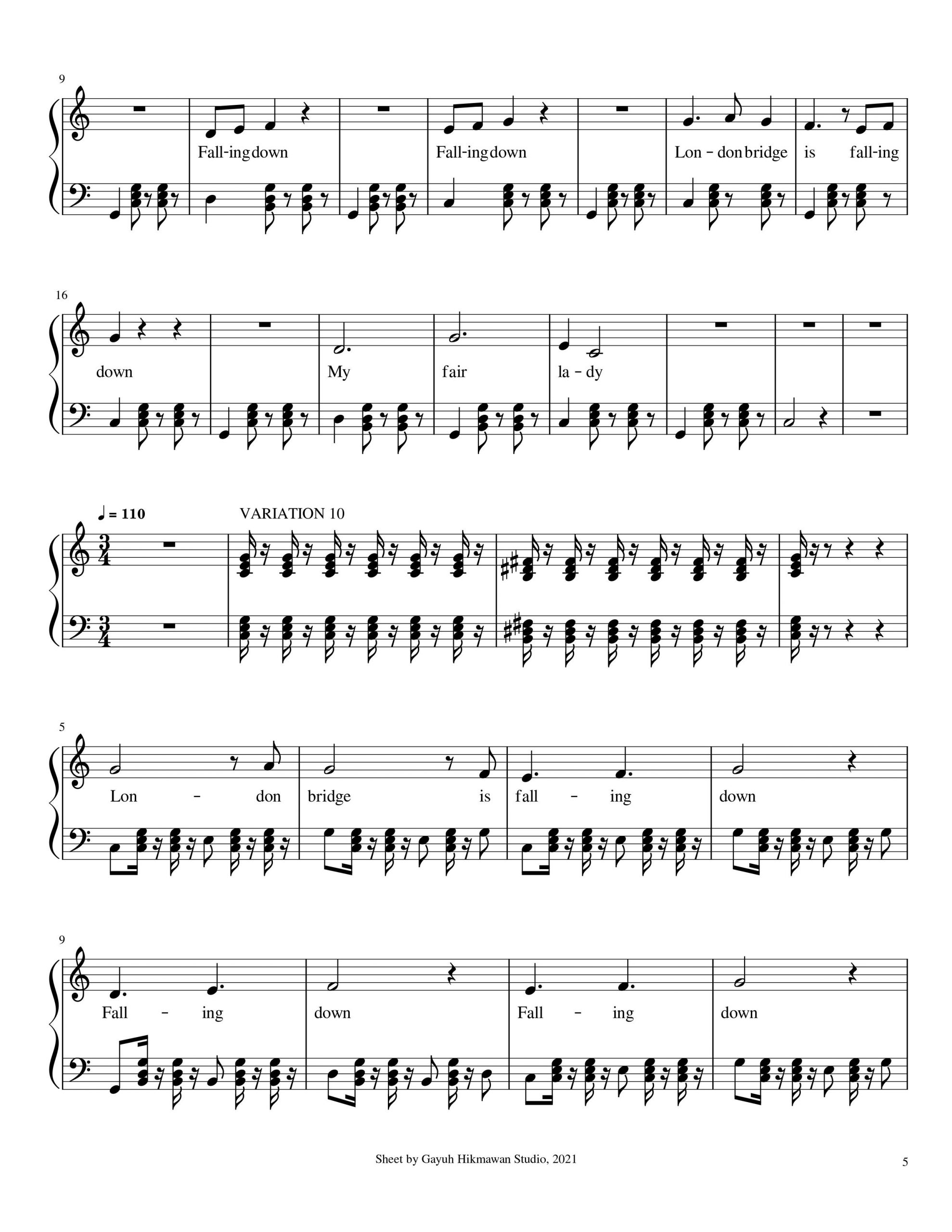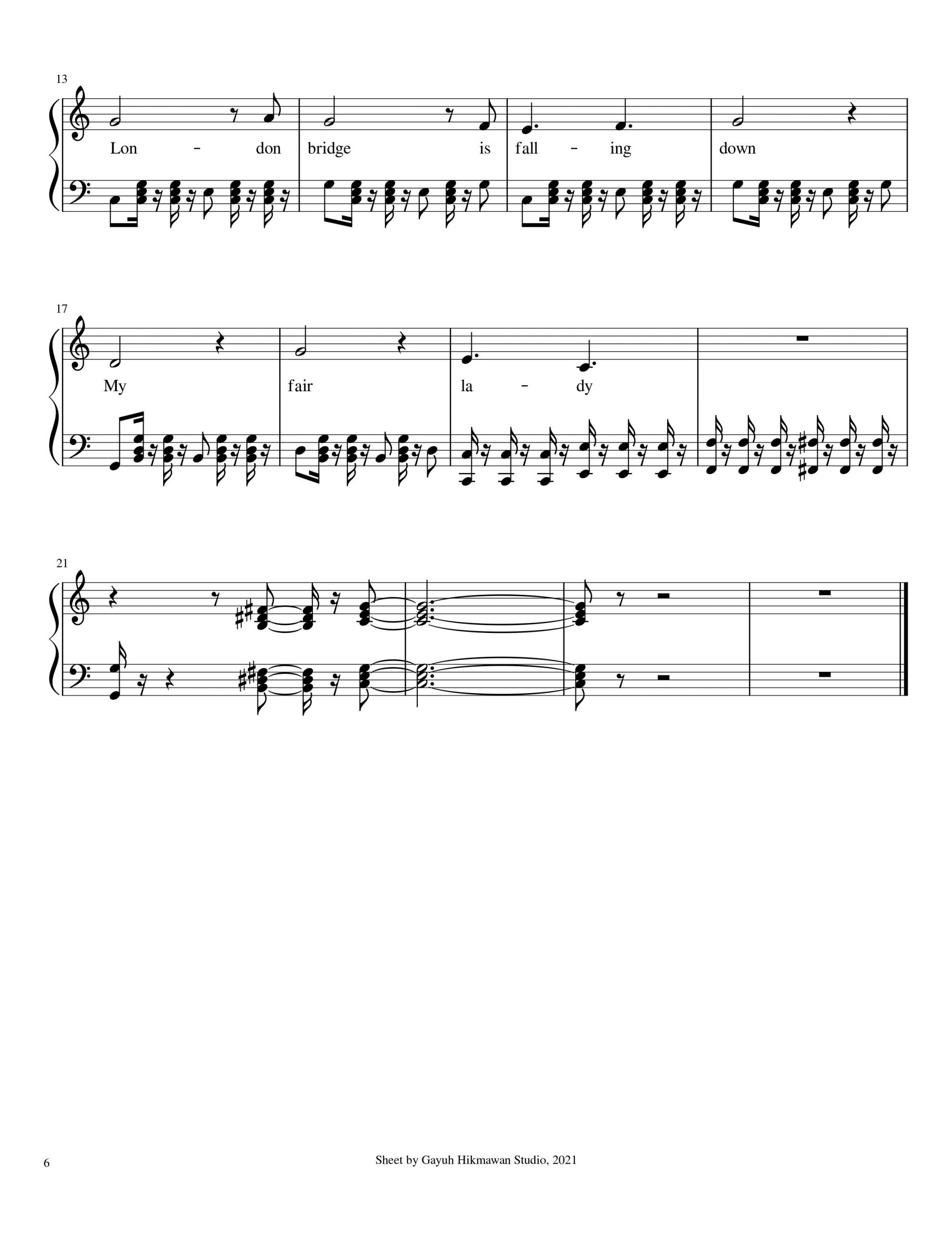 Sheet music / partitur piano lagu anak berbahasa Inggris berjudul “London Bridge is Falling Down”, pencipta tidak diketahui.